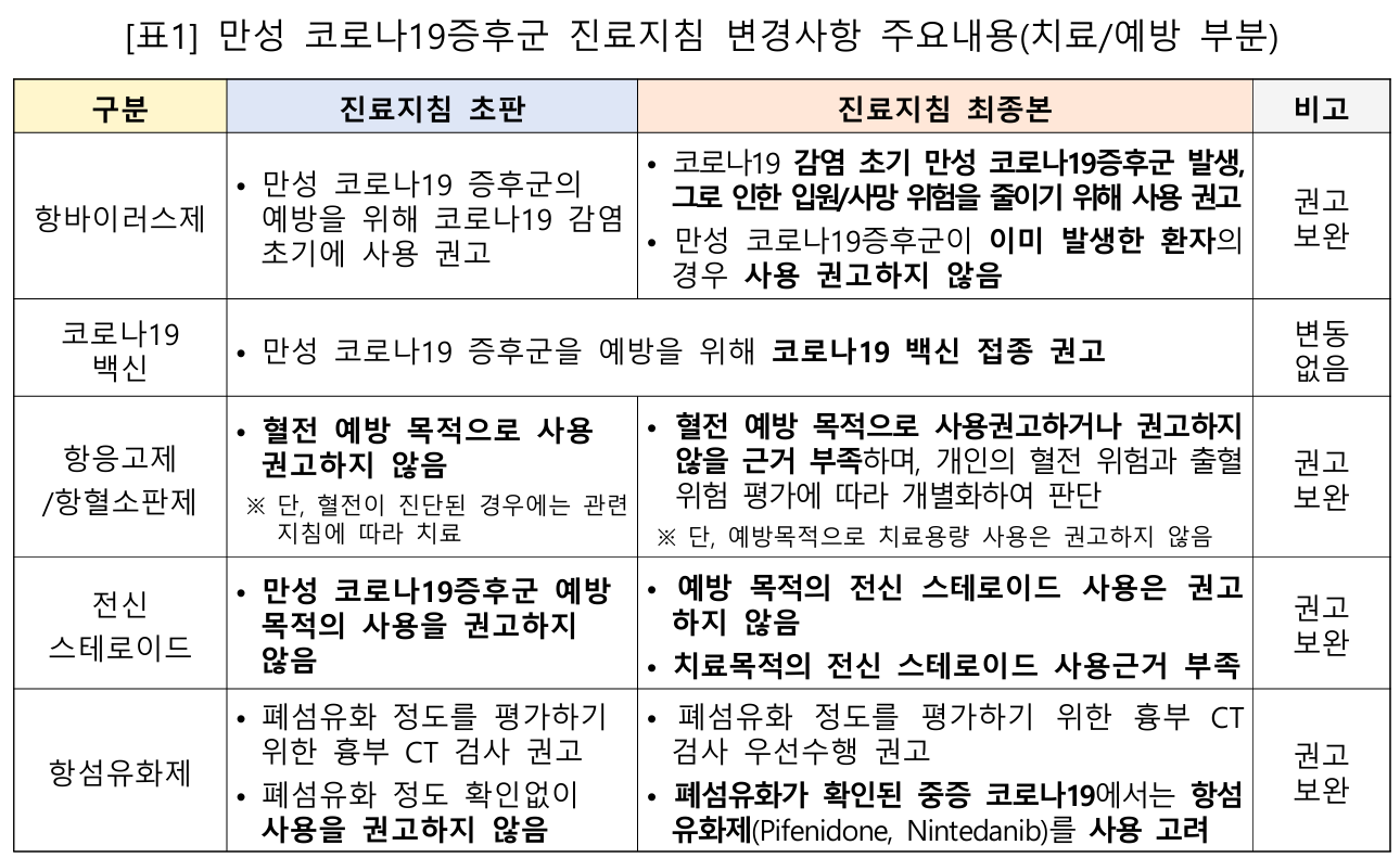 아울러 약물 요법 권고사항도 변경됐다. 항바이러스제(팍스로비드 등)는 코로나19 감염 초기에 사용 시 만성 코로나19증후군 발생 및 이로 인한 입원·사망 위험을 줄이는 목적으로 권고한다. 단 이미 후유증이 발생한 환자에게는 치료 목적으로 권고하지 않는다.
