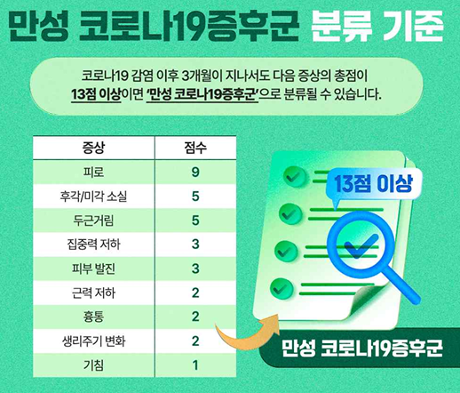 주요 증상별 배점은 ▲피로 9점 ▲후각/미각 소실 및 두근거림 각 5점 ▲집중력 저하 및 피부 발진 각 3점 ▲근력 저하, 흉통, 생리주기 변화 각 2점 ▲기침 1점 이다.