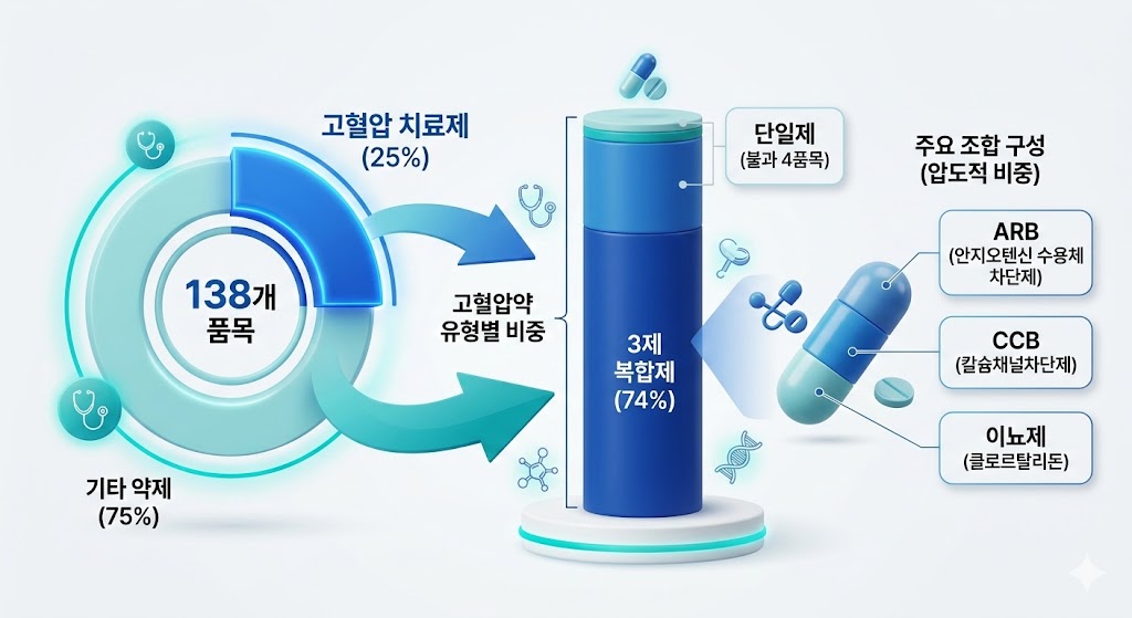 안지오텐신 수용체 차단제(ARB)와 칼슘채널차단제(CCB)에 이뇨제 클로르탈리돈을 조합한 3제가 주를 이뤘다.