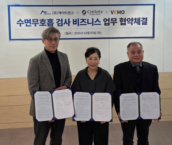크레소티는 웨어러블 심전도 검사 솔루션 전문기업 에이티센스(대표이사 정종욱), 비대면 건강 관리 플랫폼 전문기업 베모(대표이사 서지원)와 수면무호흡 비즈니스 업무협약을 체결하고, 수면무호흡패치 'AT-SleepHome(ATP-T200)' 유통 및 공통 마케팅을 추진한다고 밝혔다.