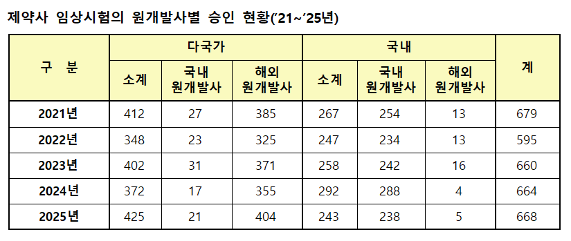 다국가 임상시험은 ’24년 372건에서 ’25년 425건으로 전년 대비 약 14% 증가해 글로벌 신약에 대한 국내 환자들의 접근성이 확대된 것으로 나타났다.