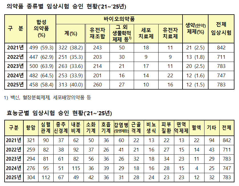 식품의약품안전처(처장 오유경)는 2025년 의약품 임상시험 승인 현황을 분석한 결과 전년(747건) 대비 4.8% 상승한 전체 783건의 임상시험이 승인됐다고 6일 밝혔다.