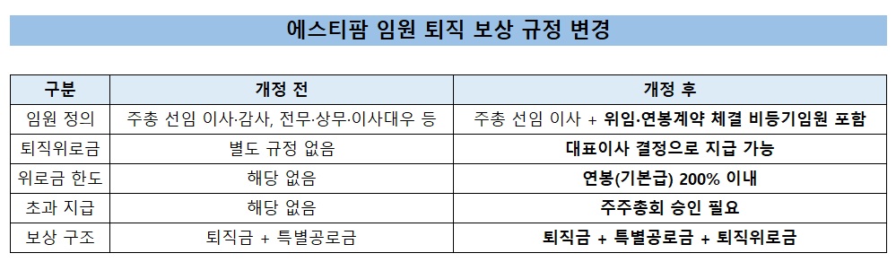 이번 개정으로 에스티팜 임원 보상 체계는 퇴직금에 더해 특별공로금과 퇴직위로금이 결합된 구조를 갖추게 된다. 기존 규정에는 재임 중 특별한 공로가 있는 임원에게 퇴직금 외 특별공로금을 지급할 수 있도록 했으며 지급 한도는 퇴직금의 50% 이내로 제한돼 있다.