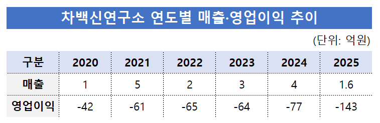 이 회사의 법차손 비중이 커진 배경에는 매출 부재와 연구개발비 비용 증가가 있다. 차백신연구소는 상장 이후 연간 매출이 2022년 2억원, 2023년 3억원, 2024년 4억원에 머무는 등 사실상 의미 있는 매출을 내지 못했다. 반면 핵심 파이프라인 임상이 이어지면서 매년 60억원 규모 연구개발비를 꾸준히 투입하며 영업손실 폭을 키웠다. 여기에 판매관리비 부담까지 더해지면서 법차손 비율이 100%를 넘는 수준까지 확대된 것이다.