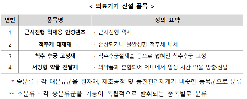 개정안에 따르면 그간 소분류 품목이 없어 중분류 또는 한시 분류 품목으로 허가받아야 했던 ▲근시진행 억제용 안경렌즈 ▲척추체 대체재 ▲척추 후궁 고정재 ▲서방형 약물 전달재 4개 품목이 새롭게 신설됐다.