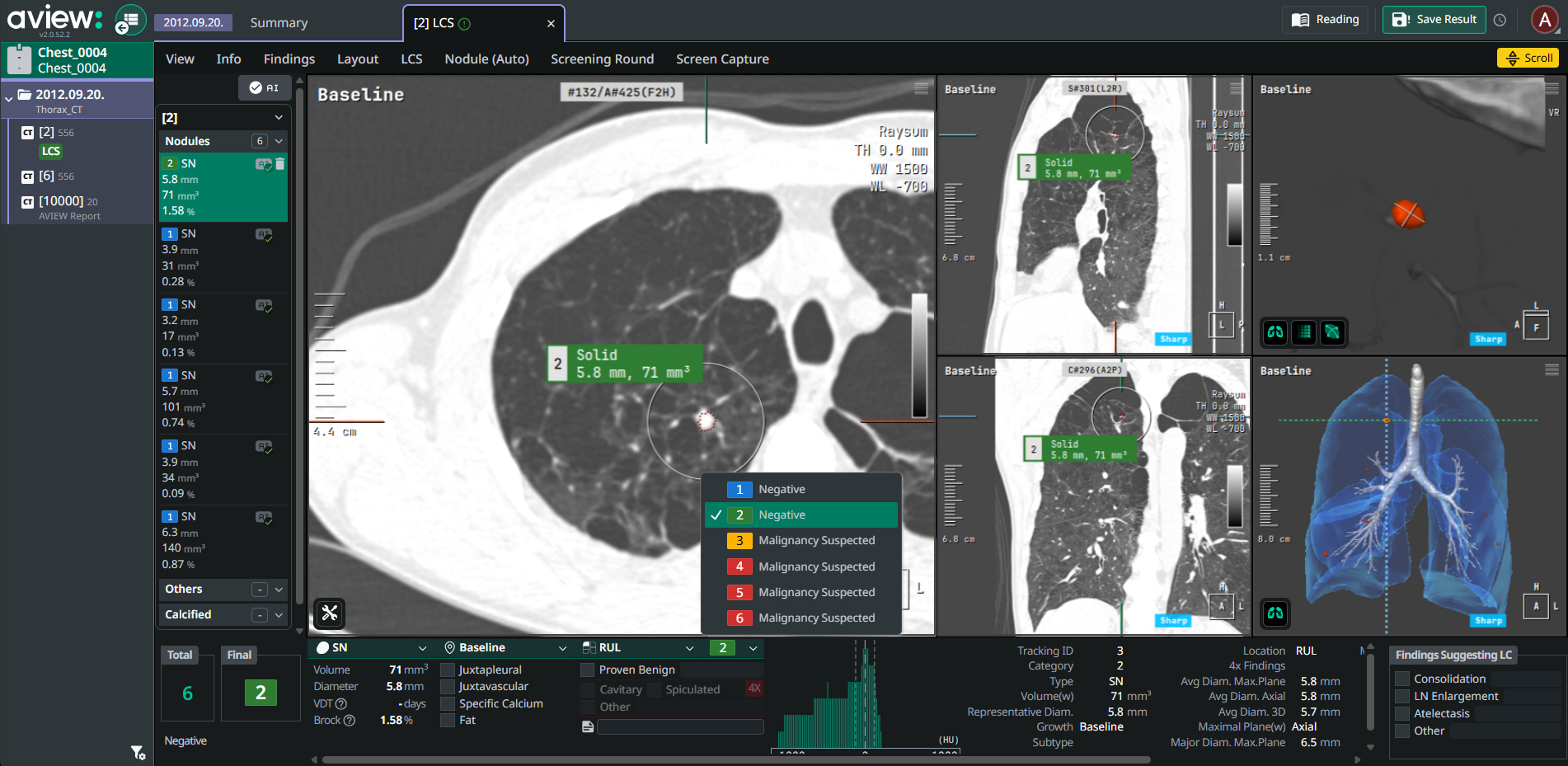 'AVIEW LCS'는 폐결절 자동 검출과 정량 분석 기능을 기반으로 이전 검사와의 비교와 성장 속도 분석 등 추적 관리 기능을 제공하는 소프트웨어다.