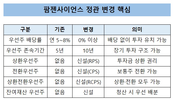 업계는 이번 정관 개정을 통해 팜젠사이언스가 투자 유치 구조를 정비한 것으로 보고 있다. 우선주 배당률 하한을 없애고 다양한 종류주식 발행 근거를 마련하면서 향후 전략적 투자자나 재무적 투자자를 유치할 수 있는 제도적 기반을 갖췄다는 평가다. 이는 3월 정기 주주총회에서 확정된다.