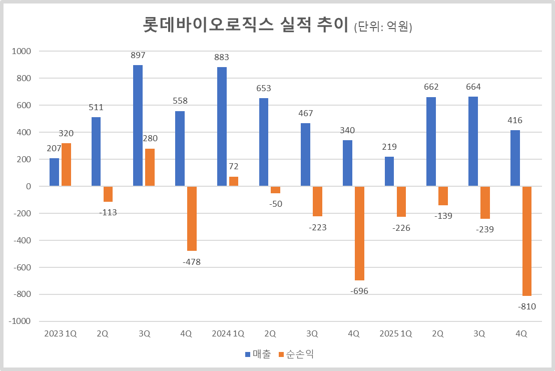 21일 금융감독원에 따르면 롯데바이오로직스는 지난해 4분기 연결기준 매출 416억원을 기록했다. 이는 전년 동기 대비 22.4% 증가한 수치다. 같은 기간 순손실은 810억원으로 전년 동기보다 적자 폭이 114억원 확대됐다.