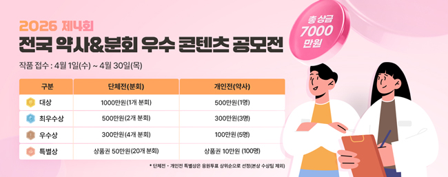 데일리팜=강혜경 기자] 총 상금 7000만원이 걸린 '2026 제 4회 전국 약사&분회 우수 콘텐츠 공모전'이 막을 올린다.