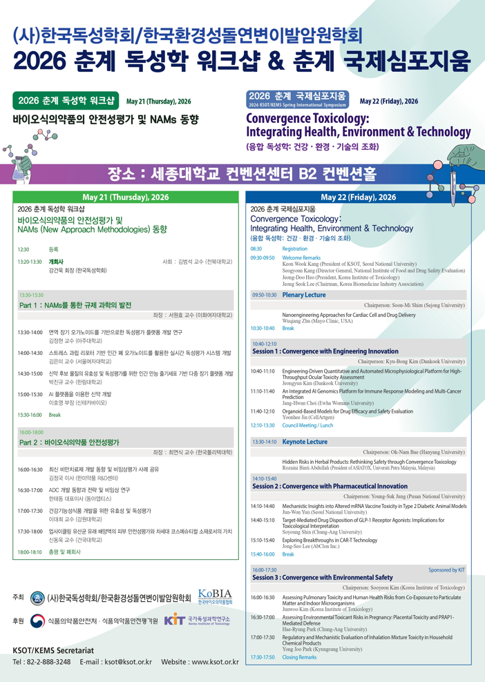 한국바이오의약품과 공동 주최, 국가독성과학연구소가 후원하는 이번 행사는 '바이오식의약품의 안전성평가 및 NAMs 동향'을 주제로 한 워크숍과 '융합 독성학: 건강·환경·기술의 조화'를 주제로 한 국제심포지움으로 구성된다.