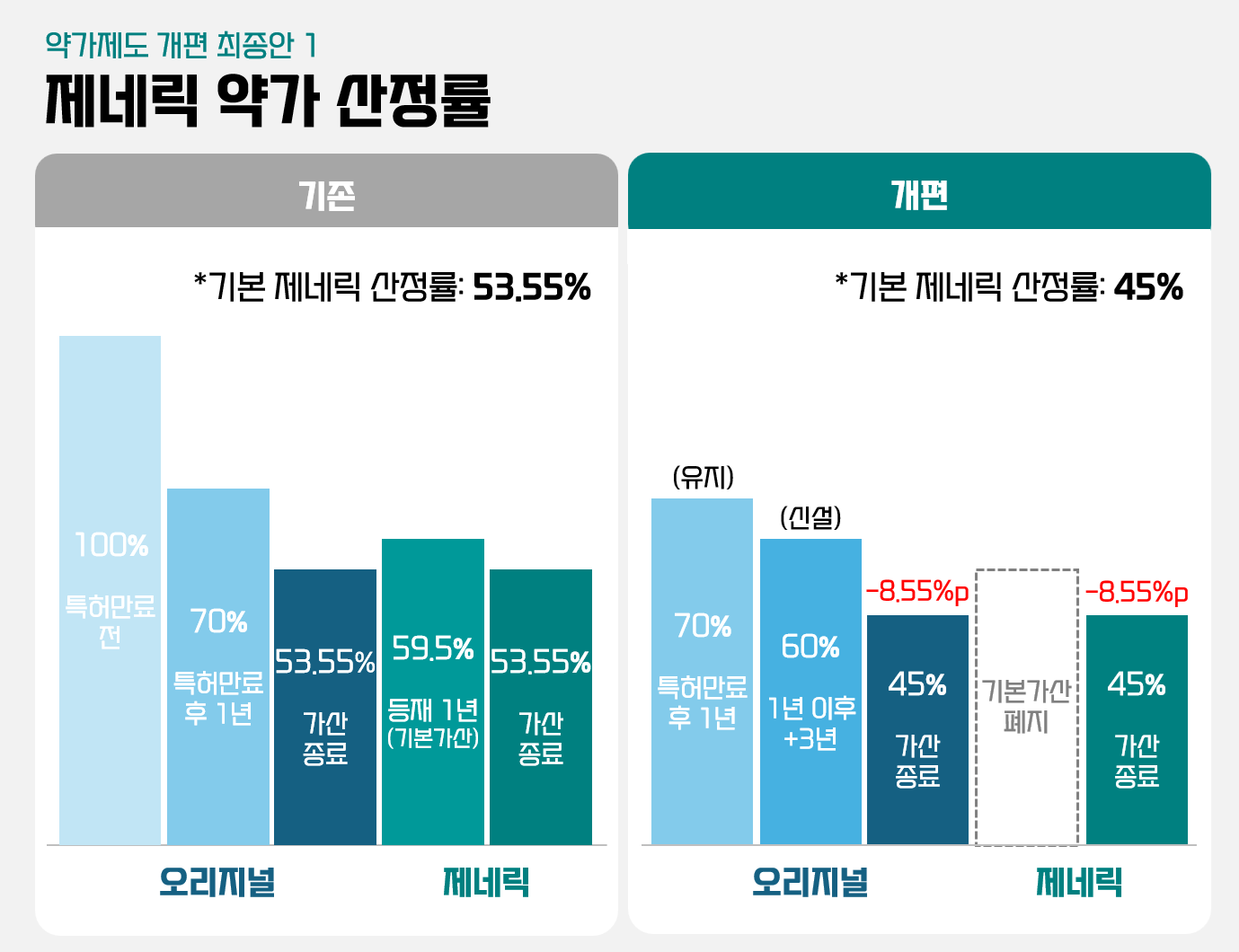 개편 약가제도에서는 특허만료 의약품과 제네릭 모두 특허만료 신약의 53.55%에서 45%로 내려간다. 복지부는 기존 의약품을 2012년 이전과 이후 등재된 그룹을 구분해 개정 산정률 45%까지 단계적으로 조정하겠다는 방침이다. 제네릭과 제네릭 등재 특허만료 오리지널 의약품이 약가인하 대상이다.