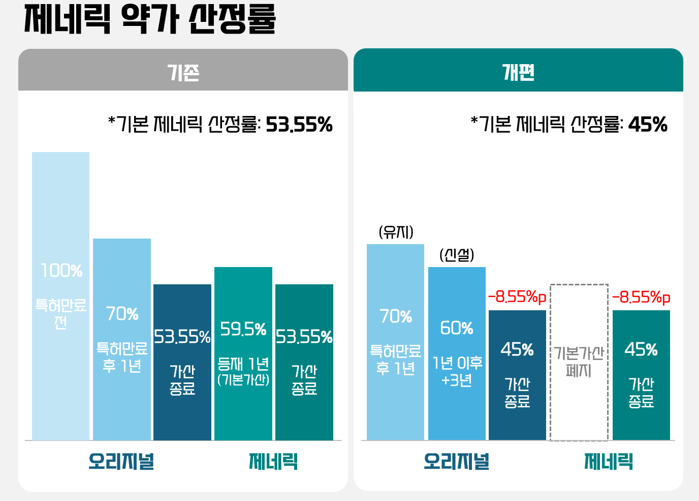 보건복지부가 지난달 26일 건강보험정책심의위원회에서 논의한 개편 약가제도에서는 특허만료 의약품과 제네릭 모두 특허만료 신약의 53.55%에서 45%로 내려간다. 산술적으로 제네릭 약가가 16.0% 깎인다는 의미다.