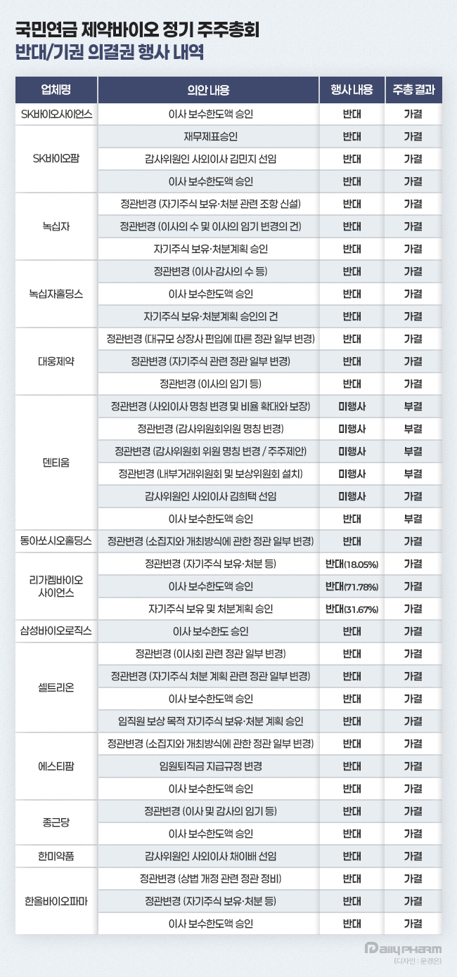 2일 업계에 따르면 국민연금은 올해 제약바이오 기업 18곳 정기 주총에서 총 190개 안건에 대해 의결권을 행사했다. 대상 기업은 SK바이오사이언스, SK바이오팜, 녹십자, 녹십자홀딩스, 대웅제약, 덴티움, 동아쏘시오홀딩스, 동아에스티, 리가켐바이오사이언스, 삼성바이오로직스, 삼성에피스홀딩스, 셀트리온, 에스티팜, 유한양행, 종근당, 한미사이언스, 한미약품, 한올바이오파마 등이다.