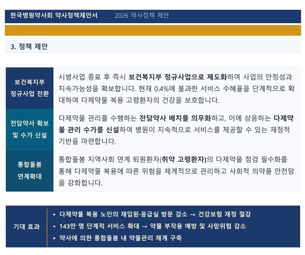 병원계 역시 제도화 요구에 힘을 보태고 있다. 병원약사회는 최근 정책제안서에 ‘다제약물관리 병원 모형 정규사업화’를 포함시키며 정부 차원의 사업 전환을 공식 요구했다.