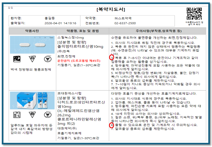 퍼스트디스 역시 마약 및 향정신성의약품에 대해 복약지도서에 적색 글씨로 '운전금지(도로교통법 제45조)', 'Do Not Drive(Road Traffic Act Art.45)' 등 한글과 영문버전으로 표출되도록 서비스를 업데이트 했다.