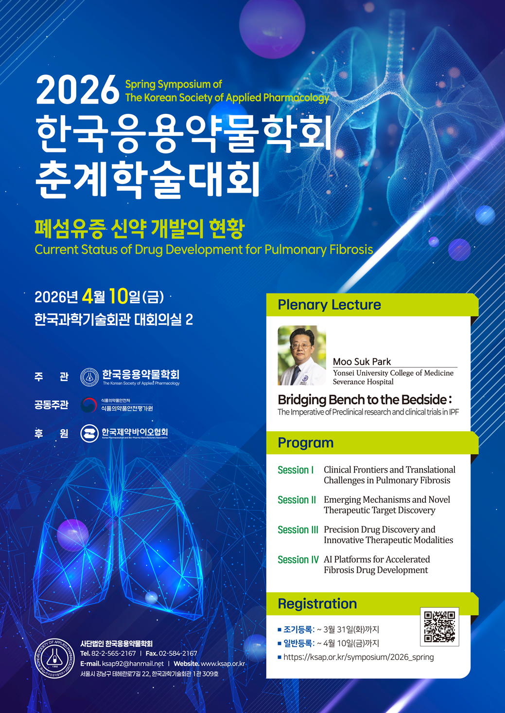 [데일리팜=정흥준 기자]한국응용약물학회(회장 이충재, 충남대 의대)가 오는 10일 한국과학기술회관 대회의실 2에서 ‘폐섬유증 신약 개발의 현황(Current Status of Drug Development for Pulmonary Fibrosis)’을 주제로 제34차 춘계학술대회를 개최한다.