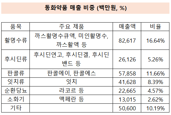 이 같은 적자 구조는 동화약품의 전체 실적에도 부담으로 작용하고 있다. 지난해 동화약품 매출은 4964억원으로 전년(4649억원) 대비 증가했지만, 영업이익은 2억원대에 그쳤다.