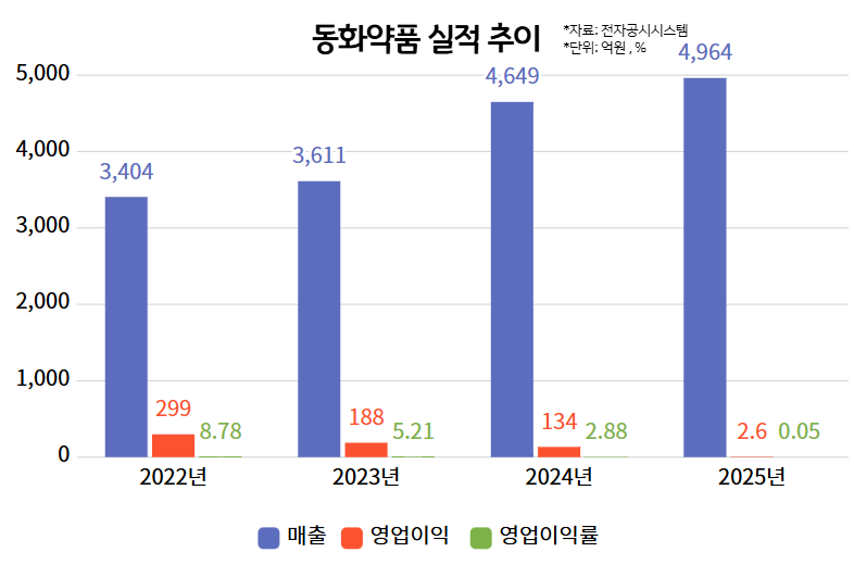 수익성 지표 역시 빠르게 악화되고 있다. 동화약품의 영업이익률은 2022년 8.78%에서 2023년 5.21%, 2024년 2.88%, 지난해 0.05%까지 하락했다. 회사 측은 경기 침체 속 일회성 비용 증가가 영업이익 급감의 주요 요인이라고 설명했다.
