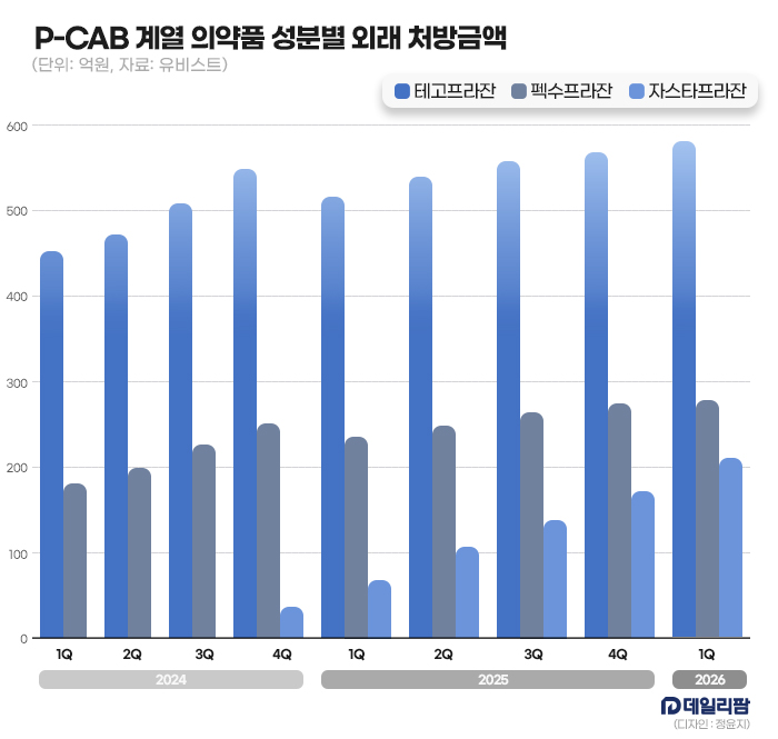 14일 의약품 조사기관 유비스트에 따르면 지난 1분기 칼륨경쟁적 위산분비억제제(P-CAB) 계열 의약품의 외래 처방시장 규모는 1076억원으로 전년 동기 대비 31.3% 증가했다. P-CAB 계열 의약품의 처방액은 2024년 1분기 637억원을 기록했는데 2년 만에 68.9% 확대됐다.