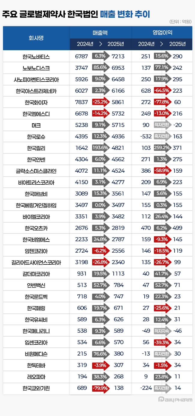 14일 금융감독원에 따르면 주요 30개 다국적제약사 한국법인의 매출은 2024년 8조7417억원에서 지난해 9조4453억원으로 8.0% 증가했다. 다국적제약사 한국법인 30곳 중 한국노바티스, 노보노디스크, 사노피아벤티스코리아, 한국아스트라제네카 등 24곳의 매출이 늘었다.