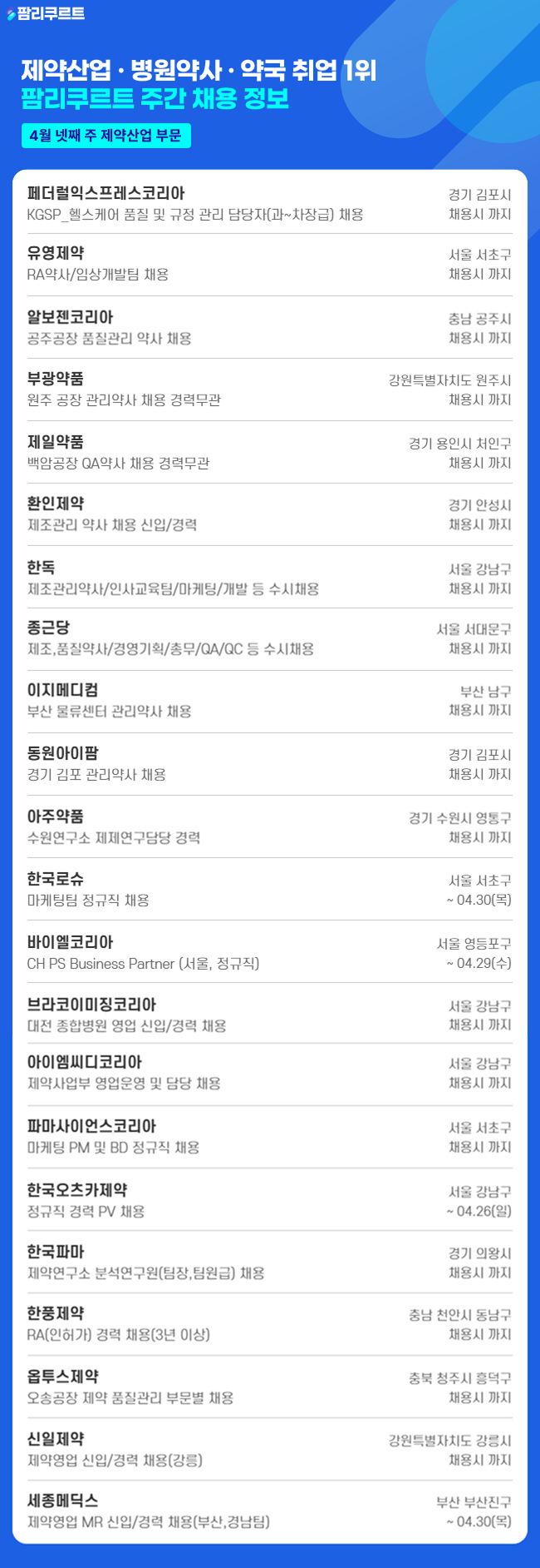 [팜리쿠르트] 페더럴·유영제약·알보젠 등 약사 채용