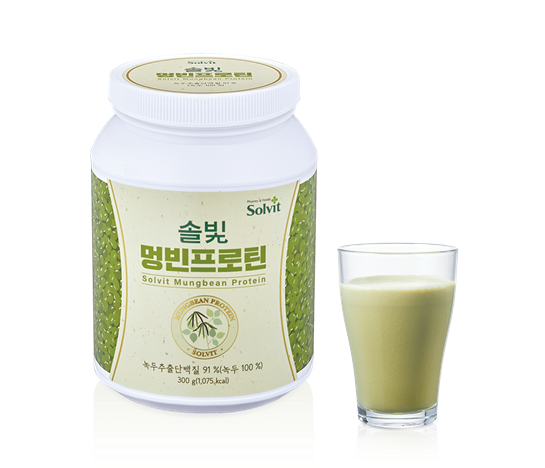 솔빛 멍빈프로틴은 녹두(Mung bean)에서 추출한 단백질을 비롯해 프락토올리고당, 저분자피쉬콜라겐, Pediococcus acidilactici, 달팽이추출분말과 노근추출분말 등을 함유한 제품이다.