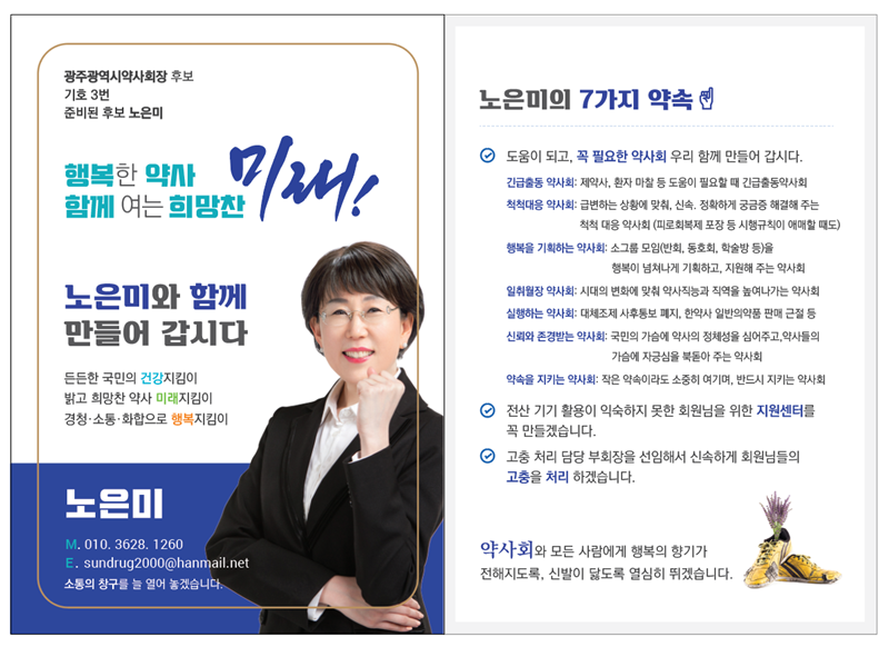 노 후보는 "급변하는 상황에 맞춰 신속, 정확하게 궁금증 해결해주는 약사회가 되겠다. 또 제약사, 환자 마찰 등 도움이 필요할 때 긴급 출동하는 약사회로 만들겠다"고 했다.