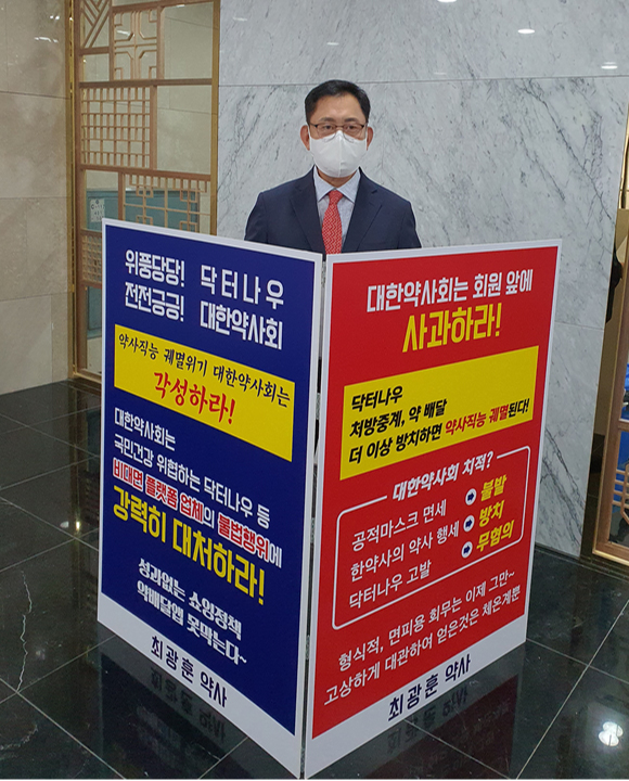 [데일리팜=강신국 기자] 최광훈 전 경기도약사회장이 "비대면 의약품 배달 플랫폼 불법행위에 강력히 대처하라"며 대한약사회관에서 1인 시위를 진행했다.