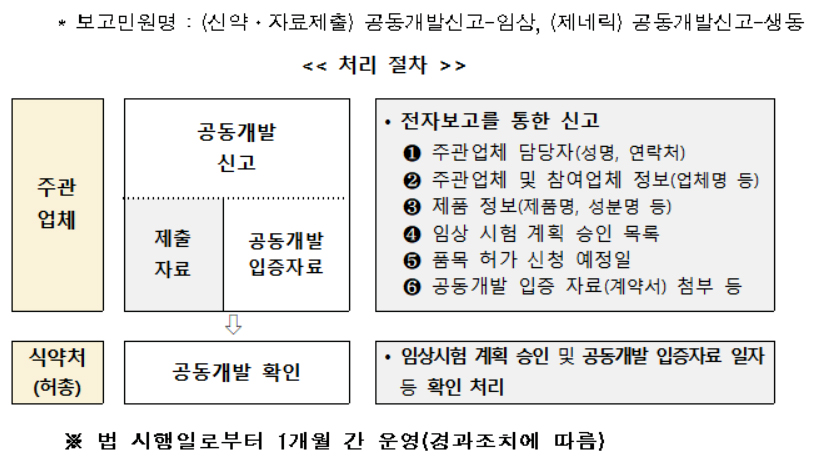 식약처는 한달간 공동개발 사실 신고 업무를 진행할 예정이다. 해당 업체들은 공동개발하기로 하고, 임상시험계획 승인을 받은 의약품에 대해 임상시험계획 승인을 받은 자가 공동개발에 참여한 업체 내역을 8월 18일까지 신고해야 한다. 이러면 1+3을 적용받지 않게 된다.