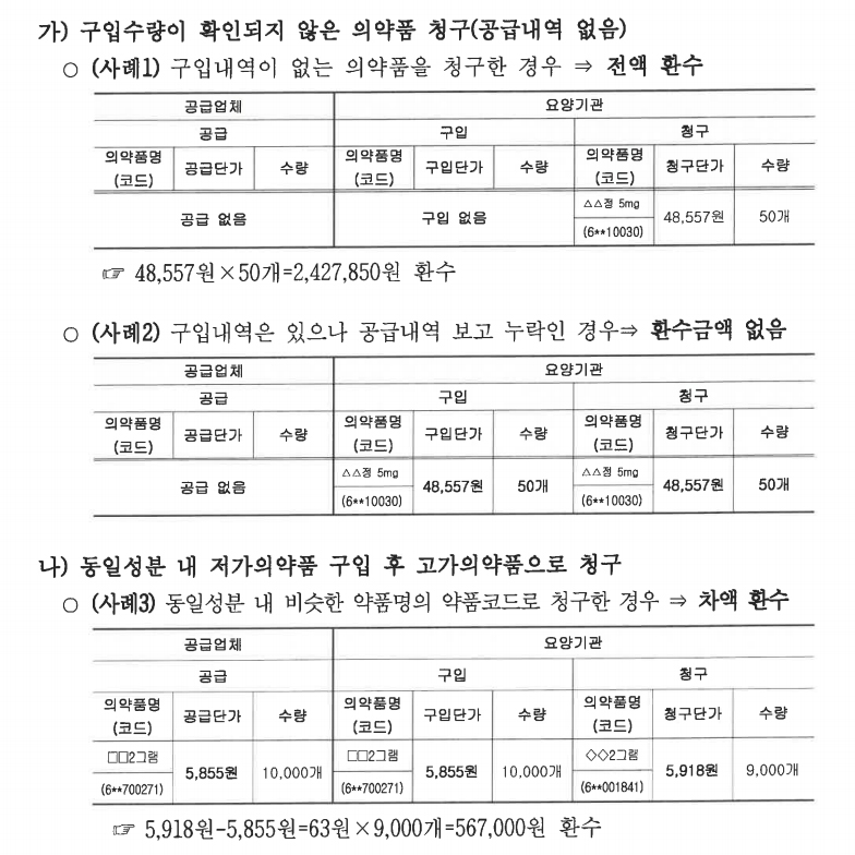 만약 공급단가가 5855원인 ○○2g 1만정을 구입한 뒤, 청구단가나 5918원인 ●●2g 9000정으로 청구하는 경우에는 56만7000원(5918원-5855원=63원X9000개=56만7000원)이 환수된다.