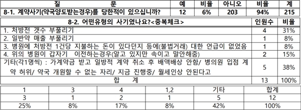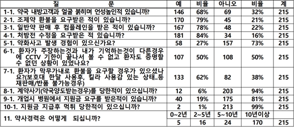 약사 45%는 "일 커지는게 싫어 손해를 감수하고 빨리 환불해준다"고 답변했다. 또한 조제약 환불을 요구 받은 약사도 170명(79%)으로 많았다.