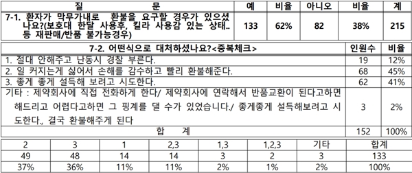 설문결과에 따르면 215명 중 133명(62%)이 환자의 막무가내 환불을 경험했다. 구매가 한참 지나거나 사용감이 있는 제품을 반품하는 경우들이었다.