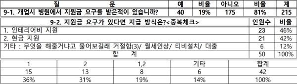 또한 부산 지역 약사들은 5명 중 1명꼴로 병원지원금 요구를 받고 있었다. 개업시 병원에서 지원금 요구를 받은 적이 있냐는 질문에 40명(19%)이 경험했다고 답변했다.
