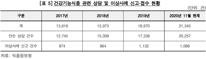 이로 인해 2017년부터 2020년까지 신고된 104건 중 74건이 건기식 이상사례로 수집되지 않았다. 이중엔 14개 제품에 대한 중대한 이상사례도 포함됐고, 11개 제품에 대한 수거와 검사가 이뤄지지 못했다.
