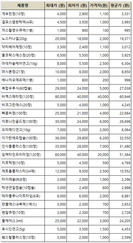아로나민골드정(100정)은 최고가 3만원, 최저가 2만 4000원이었고 삐콤씨정과 복합우루사의 가격편차는 4000원, 5000원이었다.