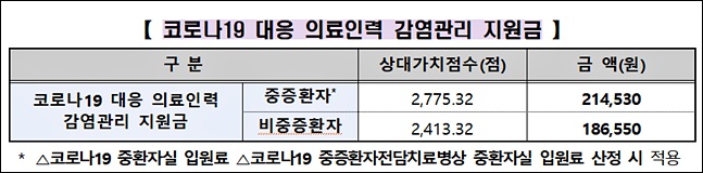 복지부는 약 6개월 진료분에 대한 수가 적용이 가능할 것으로 전망했다. 의료기관 종별과 무관히 동일 수가를 적용하나, 환자 중증도가 높으면 더 많은 인력이 투입되는 점을 반영해 중환자실 등에 입원한 중증환자는 가산 수가를 산정하는 내용도 담겼다. 중증환자는 21만4530원, 비중증환자는 18만6550원의 지원금이 책정됐다. 지원금 수령 의료기관은 지원금 전액을 코로나 대응에 참여한 의료인에게 배분해야 한다.