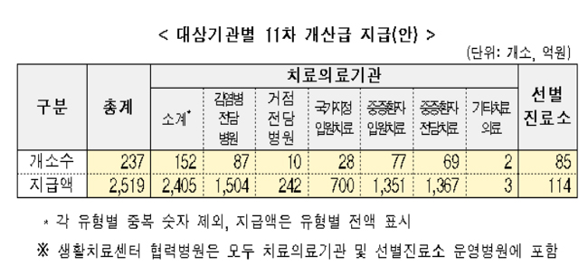 감염병전담병원 등 코로나19 환자 치료의료기관에게 지급되는 11차 개산급은 237개 의료기관에 총 2519억원을 지급하며, 이 중 2405억원은 감염병전담병원 등 치료의료기관(152개소)에, 114억원은 선별진료소 운영병원(85개소)에 각각 지급한다.