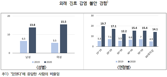 ◆환자 안전과 진료 대기 = 외래 진료 중 감염에 대한 불안감을 느낀 사람은 14.7%로 2019년(6%)보다 8.7%p 증가한 것으로 조사됐다. 이 중 남성의 경우 13.8%, 여성의 경우 15.5%로 2019년보다 각각 7.3%p, 10%p 올랐다.