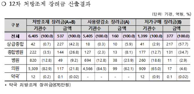 장려금은 사용량감소 160억원(5405개 기관), 저가구매 377억원(1399개 기관)으로 구분·지급되며, 약국은 이 중 저가구매 장려금만 받을 수 있다.