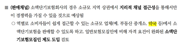 소비자가 쉽게 접근할 수 있는 소규모 업체에서 소액단기보험을 판매할 수 있도록 하고 일반보험모집인보다 자격 요건을 완화한 소액단기보험모집인 제도를 도입하는 방안을 검토한다는 계획이다.