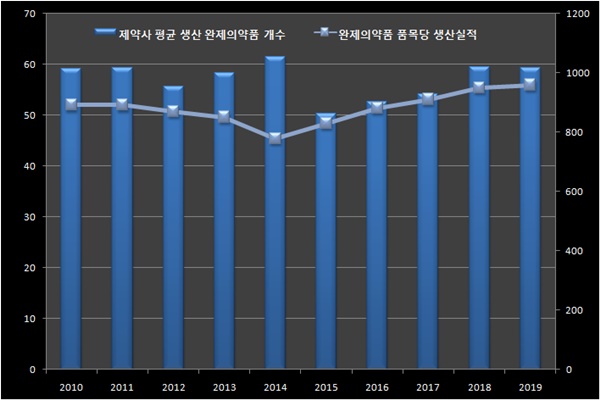 2019년 완제의약품 1개 품목당 생산실적은 9억5844만원으로 집계됐다. 2018년 9억4907만원보다 소폭 늘었지만 여전히 10억원에도 못 미치는 수준이다. 제약사들이 소규모 매출의 다수 제품을 취급하는 '백화점식 경영'이 여전히 지속되고 있다는 분석이다.