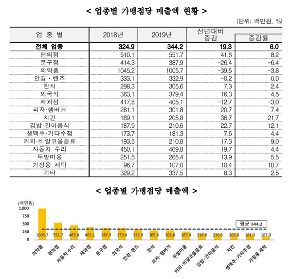 통계청은 이번 조사 결과와 관련해 “전체 업종의 가맹점당 매출액은 3억4420만원으로 전년 대비 6.0% 증가했다"면서 ”업종 별로는 치킨, 김밥·간이음식, 가정용세탁 등은 증가했지만의약품, 문구점, 제과점은 감소했다“고 밝혔다.