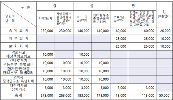 면허사용자(을)은 중앙회비 14만원, 약바로쓰기운동본부 특별회비 1만원, 환자안전약물관리본부 특별회비 1만원, 의약품정책연구소 특별회비 1만원, 장학기금 3000원 등 총 17만 3000원이다. 다만 약국 근무약사는 약화사고보험료 1만원을 더 내야 한다.