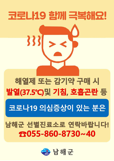 경남 남해군보건소는 안전상비약을 판매 중인 편의점을 대상으로 해열제와 감기약 구입 시 코로나19 의심증상이 지속되면 보건소 선별진료소 상담을 받을 수 있도록 안내문을 부착했다.