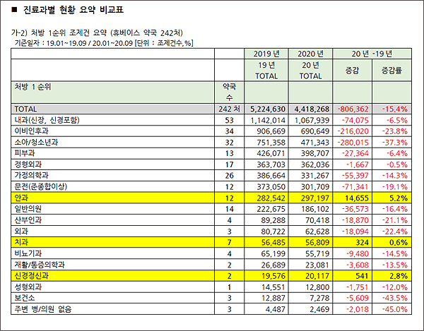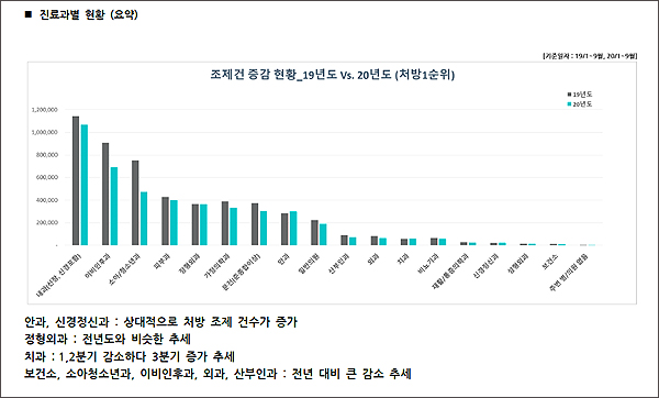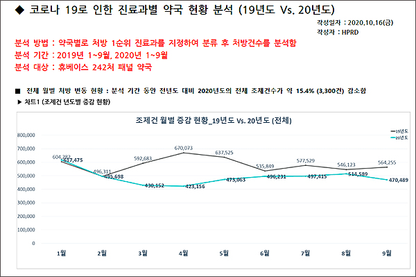 휴베이스는 이번 행사에 앞서 회원 약국 242곳의 데이터를 바탕으로 지난해와 올해 1월부터 9월까지의 진료과별 조제건수 증감 현황 분석 자료를 공개했다.