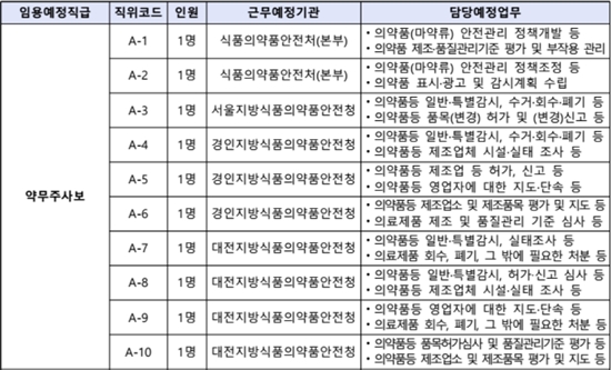 [데일리팜=정흥준 기자] 식품의약품안전처에서 본부와 지방식약청에서 근무할 7급 약무주사보 10명을 공개채용한다.