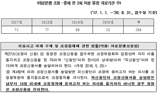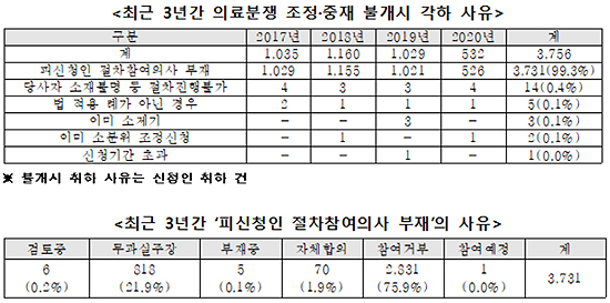 의료분쟁조정중재원에 접수돼도 조정·중재가 불개시한 대부분의 사유는 의료기관들의 조정·중재 과정의 불참이었다. 각하된 3756건 중 3731건(99.3%)이 피신청인인 의료기관이 참여의사를 밝히지 않아 조정·중재를 할 수 없었다. 참여의사를 밝히지 않은 사유 역시 대부분은 단순히 참여에 대해 거부(2,831건, 75.9%)하거나 무과실을 주장(818건, 21.9%)하는 것이었다.