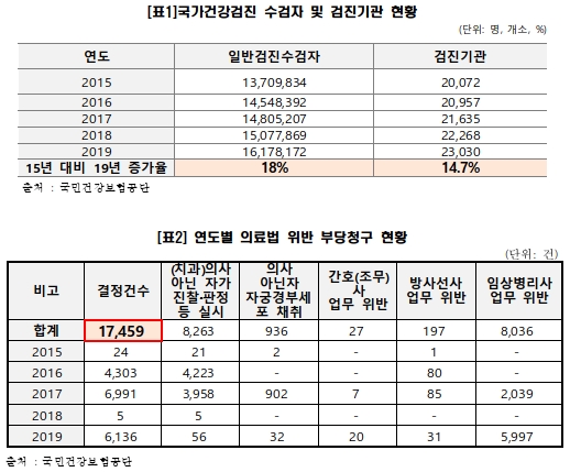 건강검진 이용량이 크게 증가하면서 ▲대리진료(검진)로 인한 의료법 위반 ▲의료기관의 건강검진 부당청구가 대표적인 문제로 대두됐다.