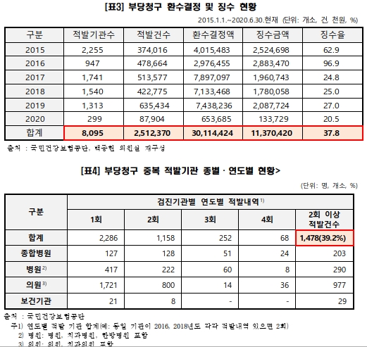 특히 2번 이상 적발된 건강검진 기관도 최근 5년간 1,478여개로 전체의 39.2%를 차지했다.