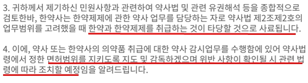 결국 비한약제제로 분류가 되는 의약품의 경우 한약사의 면허범위를 벗어나기 때문에 이를 조치해달라는 주장이었다.